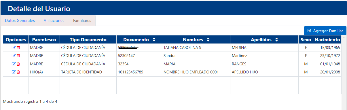 El usuario puede visualizar los datos registrados en la empresa, describe el tipo y número de documento, nombres y apellidos, estado civil, tipo y finalización de contrato, dirección de residencia, cargo, celular,Email, talla de vestuario y Calzado.