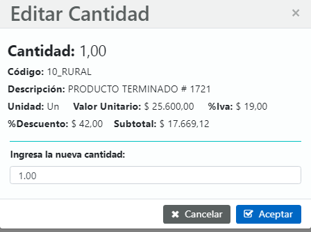 11.3 Aceptar: Este botón le permite Aceptar la edición de la cantidad del producto